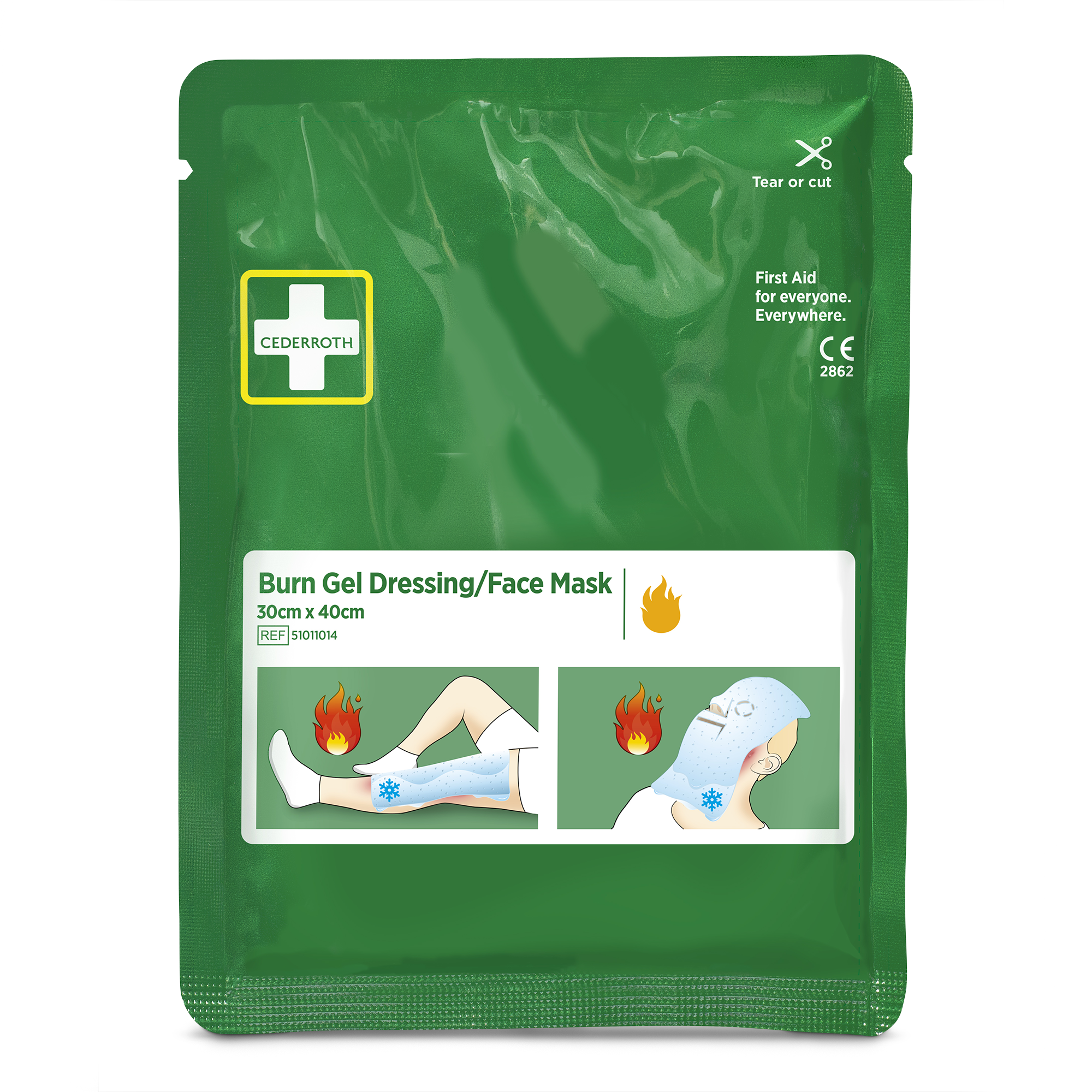 Stor, steril brännskadekompress. Snabb avkylning & effektiv smärtlindring vid första och andra grade ns brännskador på större ytor som armar, ben, bröst eller ansikte (utstansade hål för ögon, näsa och mun). Kyla hindrar att skadan går djupare ner i huden. Enkel användning med tydliga instruktioner.